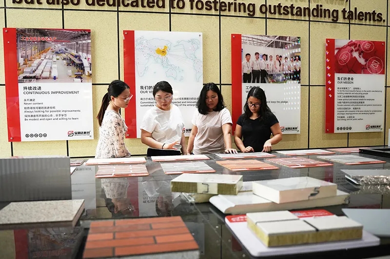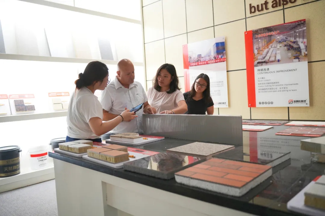 寶潤達外貿部朱經理等人進行了熱情接待,并帶領Webb先生一行參觀了寶潤達聚氨酯復合板、外墻保溫裝飾一體板、冷庫板等產品,隨后詳細解答了Webb先生在安裝過程中遇到的問題,闡述了專業的技術經驗,并提供了切實有效的解決方案。